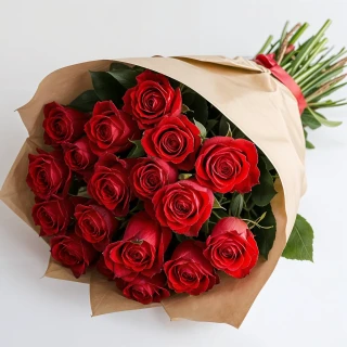 Наши красные розы отобраны с любовью и заботой, чтобы гарантировать их свежесть и безупречный вид. Они аккуратно собраны в стильной крафтовой упаковке, которая придаёт букету естественный и современный вид. Завершает композицию роскошная атласная лента, добавляющая нотку утонченности и элегантности.